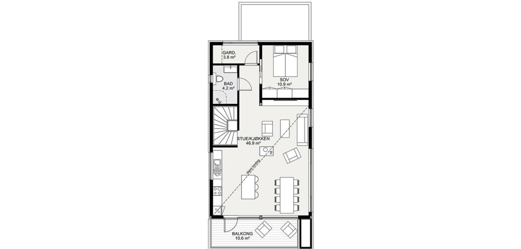 Denne versjonen av Alta har fått et stilig overbygd inngangsparti, med en praktisk sportsbod rett ved inngangsdøren. Der kan man enkelt sette fra seg barnevogn, sparkesykler, akebrett og andre ting en aktiv familie har, men ikke trenger å ha med inn i huset. Når du kommer inn har du garderobe og vaskerom rett innenfor døren. Alle våte klær kan gå rett til tørk og vasking. Du har også et bad i gangen. Det er tre soverom i første etasje, hvorav det største har et romslig walk-in-closet. Det er også en TV-stue i denne etasjen, som har dør ut mot den overbygde plattingen og hagen. På grunn av den ene veggen som går ned fra fasaden her, så får man en lun og skjermet uteplass.