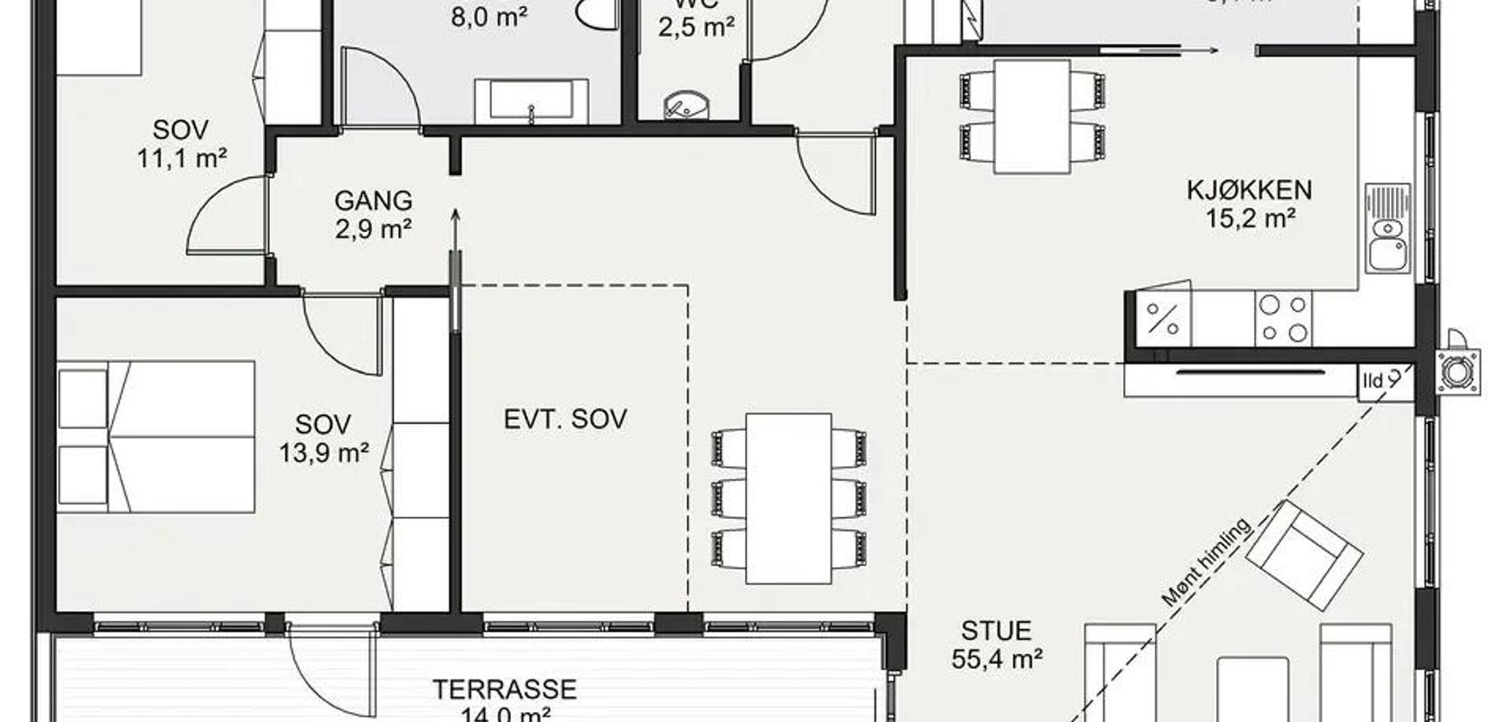 Holmen er en praktisk enebolig hvor alt er på ett plan. Boligen har en smart planløsning som deler huset inn i to soner. Når du kommer inn i entreen er det et gjestetoalett, som også er svært praktisk med små barn. Når du kommer videre inn finner du en privat sone med bad og to soverom til høyre, og det er mulig å bruke en del av oppholdsrommet til et tredje soverom. Det største soverommet har også direkte utgang til terrassen.