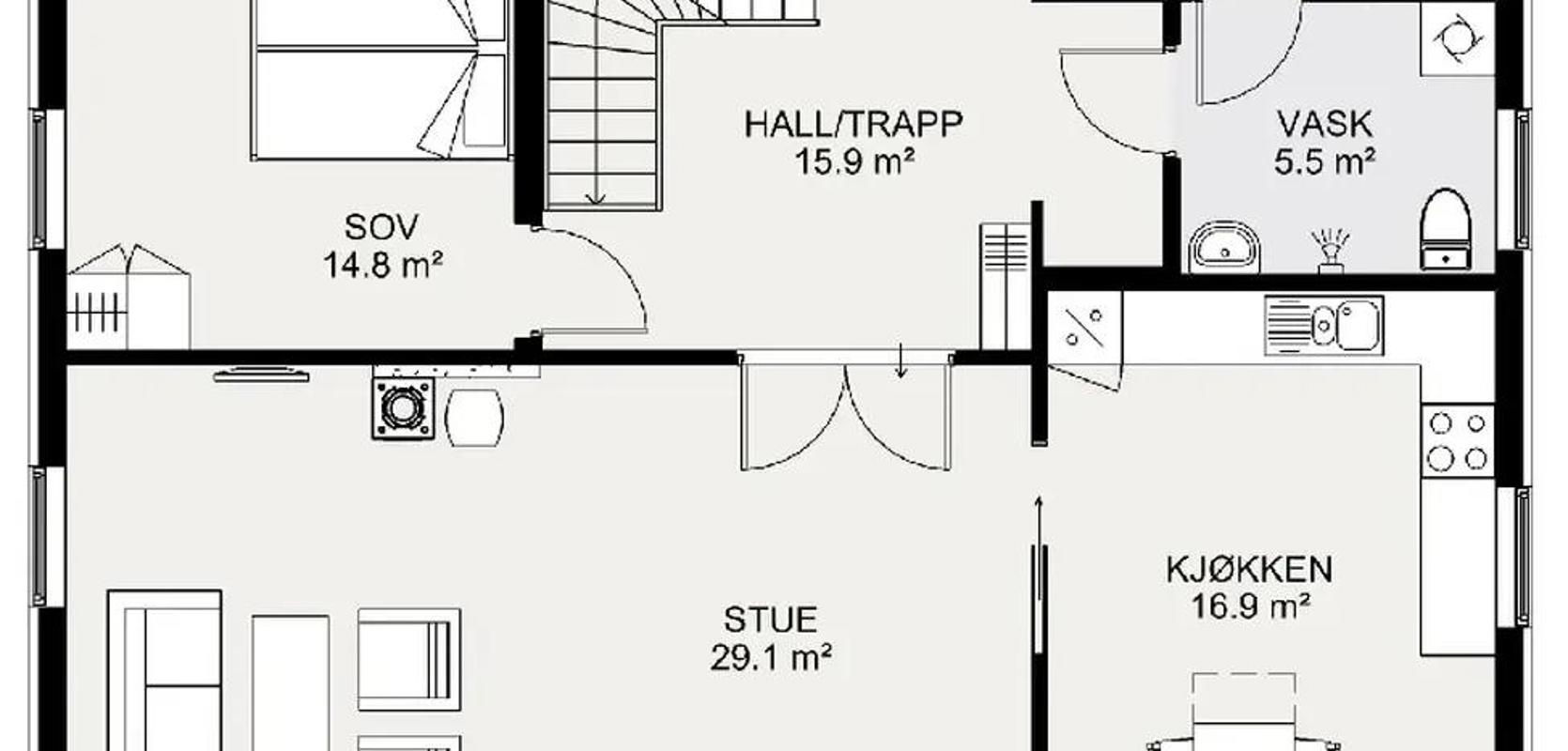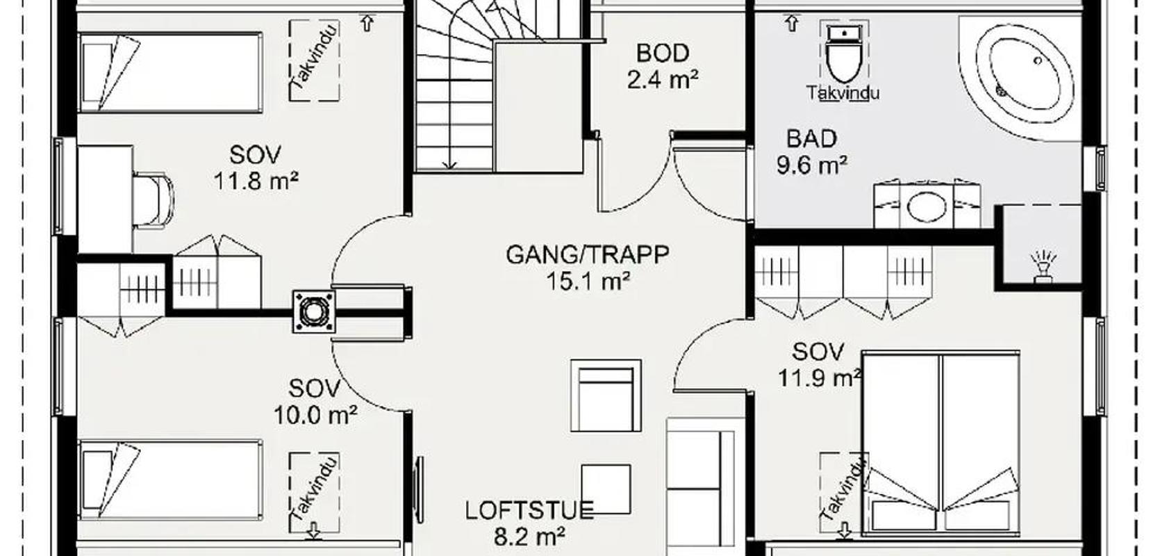 Med sine 150 kvadratmeter har huset en svært praktisk planløsning, med fire soverom, to bad og en romslig hall. Det er rikelig med plass til en stor familie. Gjennom årene har huset blitt forbedret basert på verdifulle råd og tilbakemeldinger fra våre kunder.