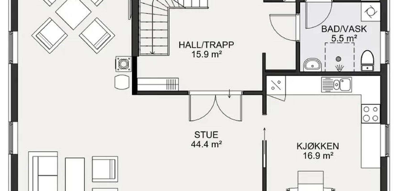 Hovedetasjen har en stor gang, en romslig stue og et funksjonelt kjøkken med plass til et spisebord. Når du kommer inn i hovedetasjen, vil du først bli møtt av en stor og luftig hall. Herfra har du tilgang til et kombinert bad og vaskerom, som har en egen bod innenfor. En dobbeltdør ønsker deg velkommen til den imponerende stuen på hele 44,4 m², som har god plass til både spiseområde og flere sittegrupper. Deler av stuen kan enkelt omgjøres til et ekstra soverom ved behov. I tillegg har du et stort og funksjonelt kjøkken med plass til et romslig spisebord.