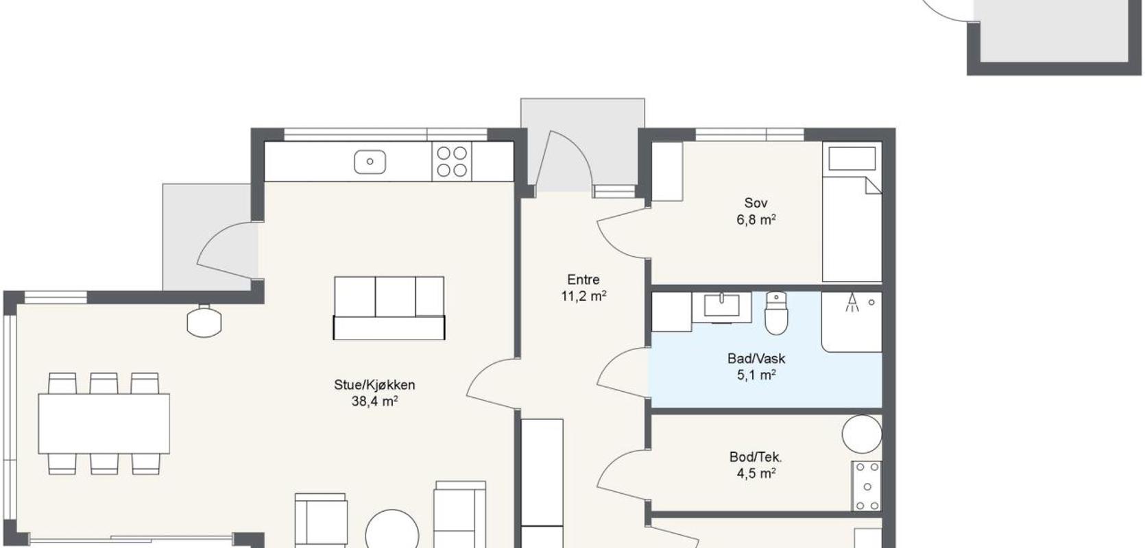 I tillegg har hytta en romslig separat bod på hele syv kvadratmeter, som gir muligheten for ekstra soveplass. Uteboden definerer sammen med hytta et avgrenset tun ved adkomst.
