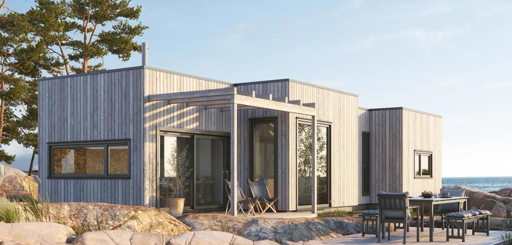 Funkishytta er utstyrt med store vinduer som gir rikelig med naturlig lys, og når hytta er plassert på en vakker tomt, fungerer vinduene som et levende maleri.